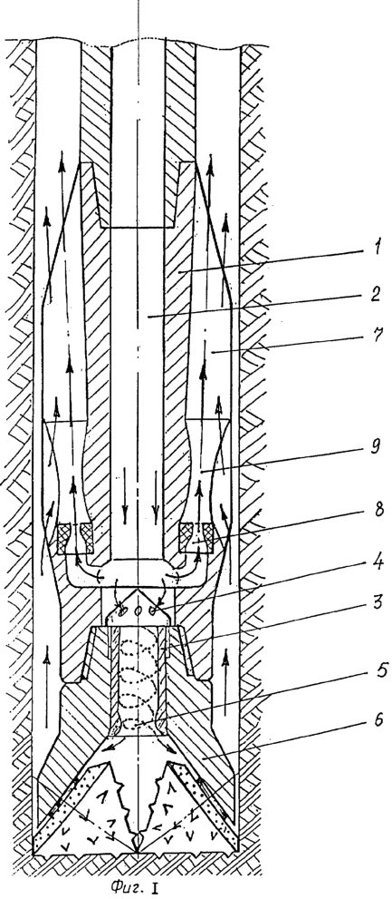 Поток буровой жидкости, попавший в сопло 8, в виде струи по продольным пазам 7 направляется по межтрубному пространству вверх. При этом сопла 8 и продольные пазы 7 с сужающими участками 9 работают как струйный эжектор, обеспечивая снижение забойного давления ниже сопла 8. В результате забой скважины одновременно подвергается гидроакустическому и депрессионному воздействиям, что приводит к интенсификации процесса разрушения забоя скважины.