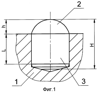 Перечень фигур чертежей. На фиг.1 показан частичный разрез по венцу шарошки бурового долота с существующей технологией запрессовки зубков, где поз. 1 обозначен фрагмент шарошки, поз. 2 – твердосплавный зубок с полусферической рабочей головкой, выступающей на высоту h над цилиндрическим хвостовиком 3 твердосплавного зубка, H – общая высота зубка, L – глубина запрессовки зубка.