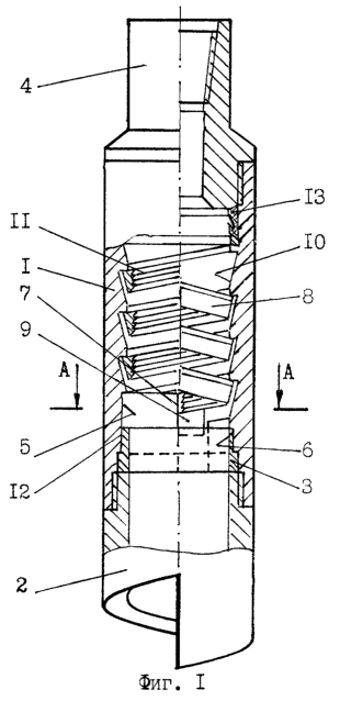 Для увеличения, например, несущей способности (грузоподъемности) труболовки спиральная коническая поверхность 10, например, корпуса 1 может быть выполнена или с цилиндрической поверхностью, образующей ленточную винтовую поверхность в нижней части спиральной конической поверхности 10 корпуса 1, или другой формы. Винтовой уступ спиральной конической поверхности 10 корпуса 1 и контактирующий с ним в крайнем верхнем положении верхний винтовой торец спирального ленточного захватывающего элемента 8 могут быть выполнены или под прямым углом к оси корпуса 1, или с клинообразным профилем для центрирования труболовки либо при заходе аварийной трубы внутрь труболовки, либо при ее освобождении от аварийной трубы, а именно: винтовой уступ спиральной конической поверхности 10 в корпусе 1 – с клинообразным профилем, односторонне сужающимся к оси корпуса 1, а верхний винтовой торец спирального ленточного захватывающего элемента 8 – с клинообразным профилем, односторонне расширяющимся от его оси.