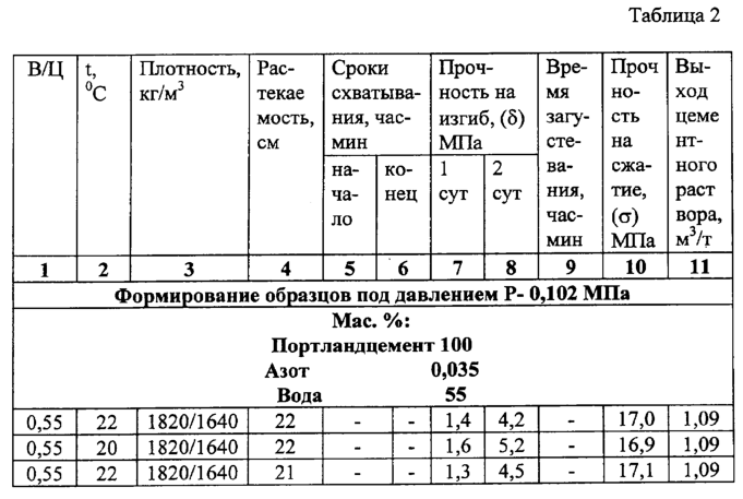 Указанный технический результат достигается тем, что в известном облегченном тампонажном растворе, включающем портландцемент, воду и алюмосиликатные полые микросферы, заполненные азотом, особенностью является то, что раствор после перемешивания насыщают азотом при следующем соотношении компонентов, масс.%: портландцемент – 85, алюмосиликатные полые микросферы – 15 и сверх 100% азот 0,035-0,04, вода 45-60.