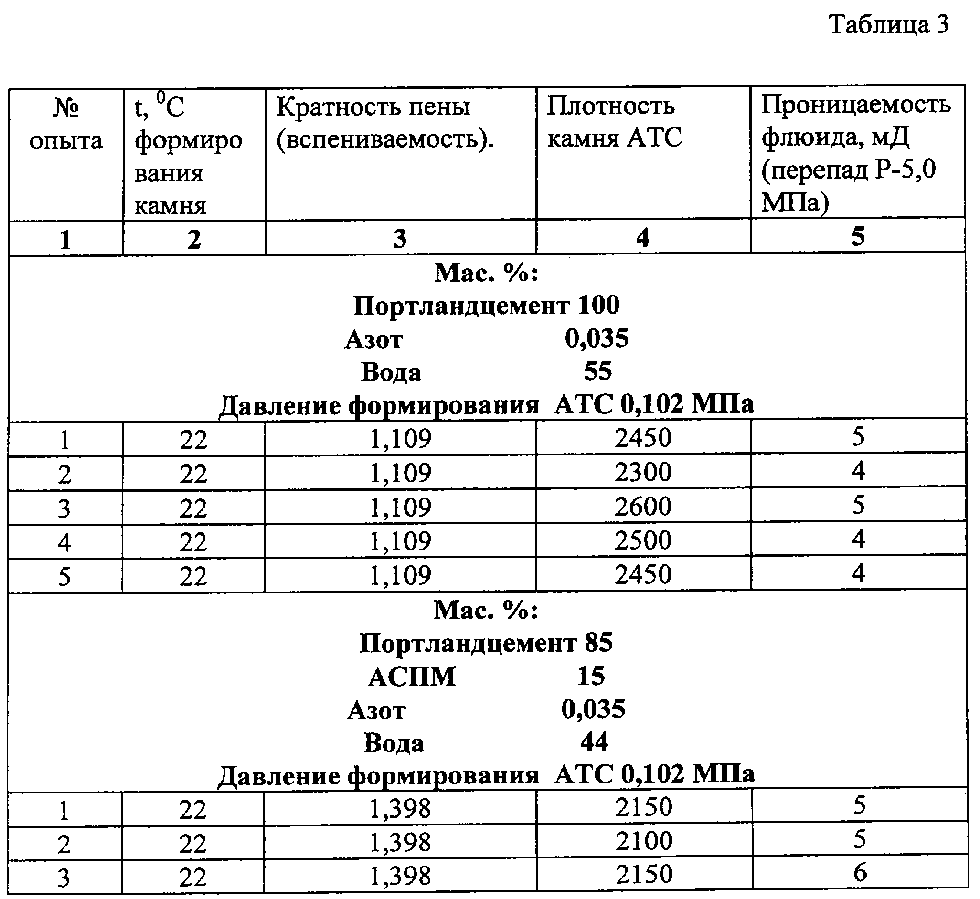 Проведен анализ результатов экспериментальных исследований изменения флюидопроницаемости цементного камня АТС с разным давлением формирования образцов. Экспериментальные исследования проницаемости флюида (керосин) проводились на оборудовании, удовлетворяющем требованиям API – модель 6100 CHANDLER ENGINEERING Formation Response Tester – Тестер реакции пород. На данном приборе исследовался поток флюида, проходящий через образец АТС, разной по своему композиционному составу. Испытание проводилось на десяти образцах АТС разного композиционного состава и с разным давлением формирования системы. После проведения десяти замеров по каждому образцу выбирались пять средних значений по плотности камня и проницаемости флюида с занесением данных в таблицу 3. Согласно проведенным исследованиям по флюидопроницаемости АТС можно сказать, что применение азотонасыщения в композиции с облегченной добавкой АСПМ дает возможность уменьшить флюидопроницаемость камня с 7-8 мД (ранее проведенные эксперименты) до 5-6 мД (давление формирования 0,102 МПа) и 3-4 мД (давление формирования 1,0 МПа).