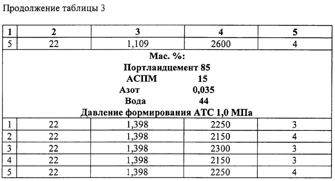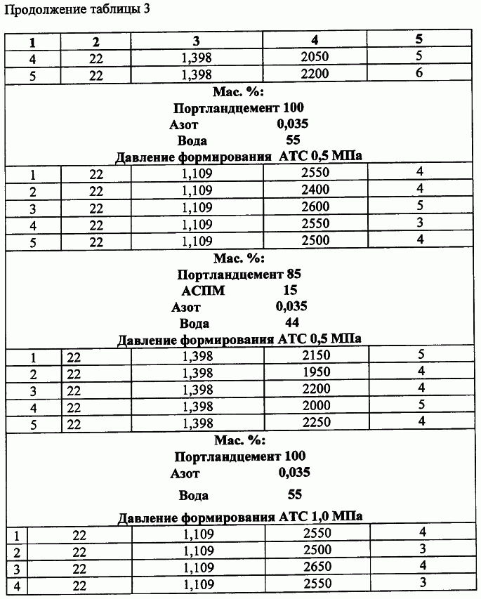Проведенные испытания тампонажных растворов показали следующее: показатели прочности цементного камня снижаются при азотонасыщении и формировании камня АТС при давлении Р-0,5 МПа, стабилизация показателей прочностных характеристик до значений, удовлетворяющих требованиям по ГОСТу применения тампонажных материалов, происходит с увеличением давления Р=1,0 МПа, изменение показателя прочностных характеристик цементного камня с 1,7 до 1,95 МПа (прочность на изгиб через двое суток) с применением облегчающей добавки алюмосиликатных полых микросфер (АСПМ), насыщенных азотом, подтверждает необходимость применения микросфер в композиции с азотом в целях дополнительного снижения плотности тампонажного раствора ниже 1400 кг/м3 и поддержании требований к показателям, предъявляемым к облегченным цементным растворам.