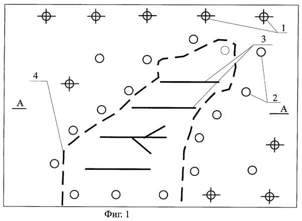 Участок месторождения разбурили проектной сеткой вертикальных добывающих и нагнетательных скважин (фиг.1) по разреженной относительно проектной сетке, осуществили его обустройство. Произвели закачку агента в нагнетательные 1 и добычу нефти из добывающих скважин 2. Произвели замеры добычи нефти, воды и закачки. Построили литологические карты и подсчитали запасы нефти, по характеристикам вытеснения определили извлекаемые запасы. На участке – 4800 тыс.т. геологических и 2400 тыс.т. извлекаемых запасов. Затем пробурили добывающие горизонтальные и/или разветвленные горизонтальные скважины 3 в зонах с меньшими значениями расчлененности, большими значениями доли коллекторов (фиг.2) 5 и в зонах слияния пластов 4 в разрабатываемом объекте разработки. Нагнетательные скважины, находящиеся на этом участке перевели под добычу, а часть добывающих скважин расположенных вдоль границ этой зоны освоили под закачку, с предварительной закачкой в высокопроницаемые пласты оторочки высоковязкой жидкости. Пустили их под закачку, произвели добычу из добывающих вертикальных и горизонтальных скважин.