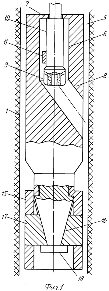 Затем вертикальную скважину 1 углубляют до отметки следующего яруса обычным образом, в скважину 1 вновь опускают собранное устройство, предварительно удлинив цилиндрический корпус 5 для перекрытия перфорационных каналов верхнего яруса, далее процесс проводки перфорационных каналов нижнего яруса повторяется.