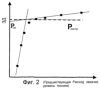 Согласно фиг.2 график забойного давления от расхода состоит из двух наклонных участков. Пересечение двух наклонных участков указывает давление распространения трещины Рраспр. Изменение наклона происходит в результате различия характеристик давления для фильтрации в материнскую породу при низком расходе и для распространения трещины при более высоком расходе нагнетания. Давление распространения обычно на 50-200 фунт/кв.дюйм больше давления смыкания трещины по причине жидкостного трения в трещине и извилистости трещины, хотя наблюдались значительно большие разности. Оценку давления смыкания трещины Рсм получают из пересечения наклонной линии распространения трещины с осью Y (нулевой расход нагнетания).