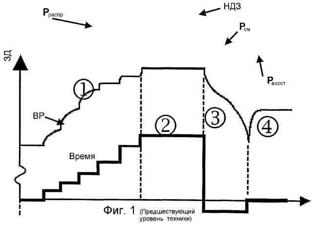 Согласно описанному выше предпочтительный способ испытания на смыкание трещины основан на испытании со скачкообразным изменением расхода или, конкретнее, на испытании со скачкообразным изменением расхода с последующими этапами откачки и восстановления давления. На фиг.1 показана типичная характеристика давления в испытании на смыкание трещины. На этой фигуре расход жидкости представлен ступенчатой кривой ВР. На этапе 1 жидкость закачивают с возрастающим расходом. На этом этапе расход закачки достигает величины, при которой забойное давление в скважине превышает давление распространения трещины Рраспр., но, в большинстве случаев, оператор продолжает увеличивать расход согласно расписанию. На этапе 2 нагнетание продолжается с тем же расходом в течение пяти-десяти минут после распространения трещины. На этапе 3 закачку останавливают и открывают клапан, чтобы немедленно начать откачку (отрицательный расход закачки). При давлении смыкания Рсм характеристика давления демонстрирует отчетливое обращение кривизны после того, как произошло смыкание, указывающее на переход от откачки из открытой трещины к откачке из материнской породы. Наконец, на этапе 4 закрытие завершается, и восстановленное давление Рвосст после закрытия служит нижней границей давления смыкания.