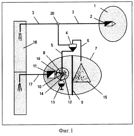На фиг.1, 2 показана схема осуществления способа, где обозначены следующие позиции: 1 – карьер; 2 – земснаряд; 3 – пульпопровод; 4 – обогатительная установка; 5 – обогащенная пульпа; 6 – осветленная пульпа; 7 – водоем; 8 – емкость (выемка); 9 – разделительная дамба; 10 – головная часть грунтозаборного устройства 11; 12 – склад обогащенного грунта; 13 – насос подачи воды; 14 – гибкий водопровод; 15 – отвал глинистых грунтов; 16 – гибкий пульпопровод; 17 – магистральный пульпопровод; 18 – карта намыва; 19 – ледяной покров карьера на продленном сезоне работ; 20 – переключатель пульпы.