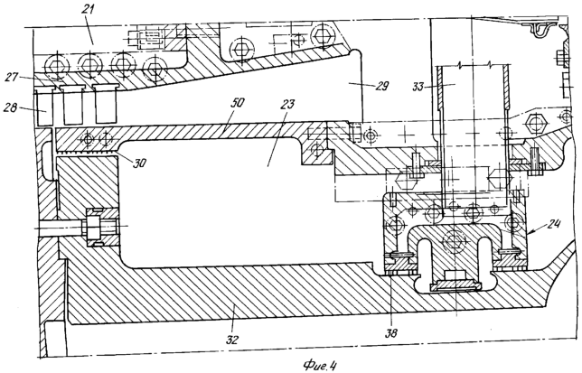 При более детальном рассмотрении Фиг. 2 можно увидеть статор 27 и лопатки 28, которые относятся к последним ступеням компрессора 21, выпускной диффузор 29 компрессора 21, вентиляционную выпускную трубу 33, которая связана с амортизатором 24 опоры, и воздухонепроницаемые уплотнения 30 и 38 внутренней полости 23; на фигуре также показана часть ротора 32.
