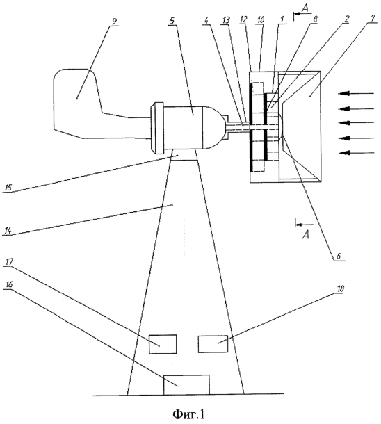 На фиг.1 представлена предлагаемая роторная ветроэлектростанция с горизонтально расположенной осью ротора.