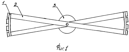 Магнитопроводы ротора ветроэлектрогенератора укреплены на дугообразном элементе 1, который соединяет две лопасти 2, установленные на ступице 3. Каждый из магнитопроводов имеет ферромагнитное тело 4, например, в форме параллелепипеда, тела соединены с помощью П-образных скоб 5 болтами 6, которые пропущены через отверстия в телах 6 (на фиг.2 болты показаны условно). Скобы 5 в свою очередь крепятся болтами 7 к дугообразным элементам 1, а сами элементы 1 с помощью уголков 8 и болтов 9 крепятся к концам лопастей.