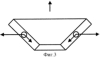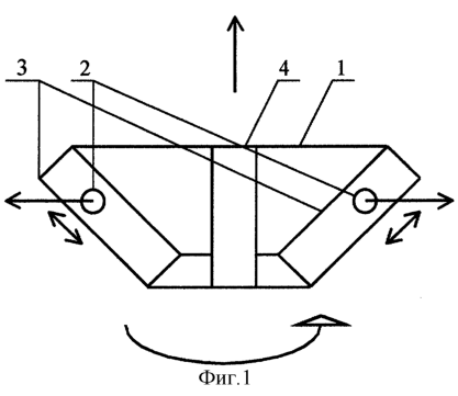 Перечень фигур: Фигура 1: вращающаяся на шарнире рама (1); грузы (2); направляющие (3); шарнир (4). Стрелками показано вращение механизма, возвратно-поступательное движение грузов, направление центробежной силы инерции. Фигура 2: вид сверху. Фигура 3: момент работы механизма – движение грузов из верхней мертвой точки в нижнюю мертвую точку. Фигура 4: момент работы механизма – возвращение грузов в исходное положение. Стрелками показаны направления движения грузов, силы, действующие на грузы, вращение рамы, направление тягового усилия.