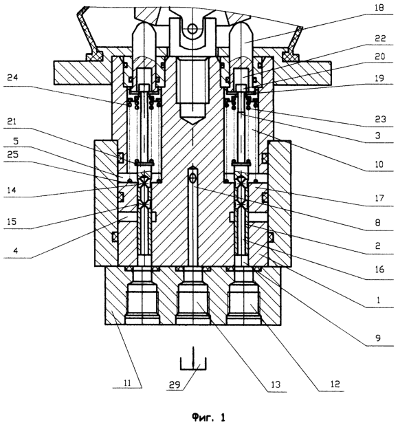 Для привода золотника 2 в корпусе 1 размещен орган управления. В приведенном примере выполнения орган управления выполнен аналогично описанному в патенте РФ №2187719, F 15 В 13/042, публ. 20.08.2002 г. Орган управления содержит ползун 18 с заключенной в нем шайбой 19, охватывающей с зазором шток 3 в промежутке между его головкой 20 и опорной шейкой 21 золотника 2. В ползуне 18 выполнена полость 22, внутри которой расположена головка 20 штока 3, имеющая возможность ограниченного осевого перемещения относительно ползуна 18. Шток 3 золотника 2 подпружинен относительно ползуна 18 пружиной 23. Ползун 18 подпружинен относительно корпуса 1 возвратной пружиной 24, опирающейся на торец 25 полости 10.
