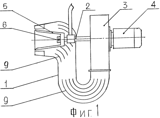 Внутри нагнетательного патрубка 1 размещен вал 2 вентилятора 3. На вентиляторе 3 закреплен привод 4. Вал привода 4 соединен с валом 2. На валу 2 жестко закреплены конусный стакан 5 и размещенная внутри него форсунка 6.