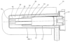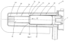 Горелка 12 имеет выполненный, по существу, в виде горшка корпус 16, в котором образована камера 18 сгорания. По расположенному по центру в корпусе 16 камеры сгорания впускному патрубку 20 воздух для горения под транспортирующим действием воздуходувки (не показана) подается в камеру 18 сгорания. По топливоподводящему трубопроводу (не показан) подается топливо, так что в камере 18 сгорания образуется способная к воспламенению или сгоранию топливовоздушная смесь. Эта доведенная до горения посредством элемента для калильного зажигания смесь создает пламя и отработавшие газы, которые покидают камеру 18 сгорания с левой на фиг.1 стороны и поступают в жаровую трубу 22.