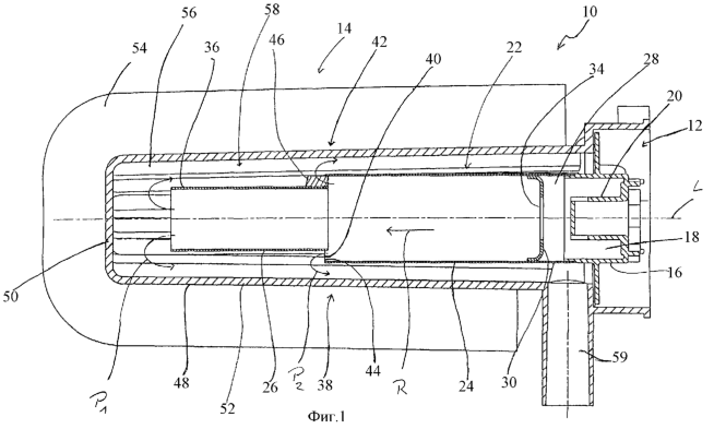 На фиг.1 части выполненного в соответствии с принципами настоящего изобретения автомобильного отопителя 10 изображены в продольном разрезе, т.е. разрезаны вдоль продольной средней оси L. Автомобильный отопитель 10 содержит горелку 12, а также теплообменник 14, из которых показаны, соответственно, только важные для понимания принципа настоящего изобретения компоненты.
