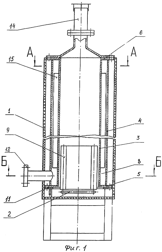 Сущность предлагаемого технического решения поясняется чертежами, где представлены: на фиг.1 – заявляемое устройство (продольный разрез); на фиг.2, 3 – заявляемое устройство (поперечный разрез А-А и Б-Б соответственно); на фиг.4, 5 – вариант выполнения подогревателя с дополнительным теплообменным элементом (продольный и поперечный разрезы соответственно).