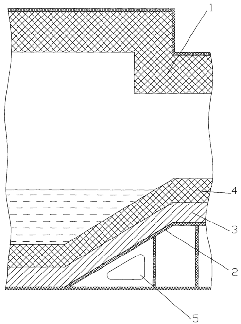 Футеровка стен закрытой металлургической емкости (миксера)1 (см. чертеж), содержит стальной кожух 2 толщиной 10 мм, внутри которого выполнена теплоизоляционная футеровка 3 толщиной 120 мм из легковесного шамота, огнеупорная футеровка 4, выполненная толщиной 280 мм из шамотных кирпичей, стальной кожух 2 может быть снабжен экраном 5, закрепленным с зазором к наружной поверхности кожуха 2, или ребрами охлаждения (не показано на чертеже).