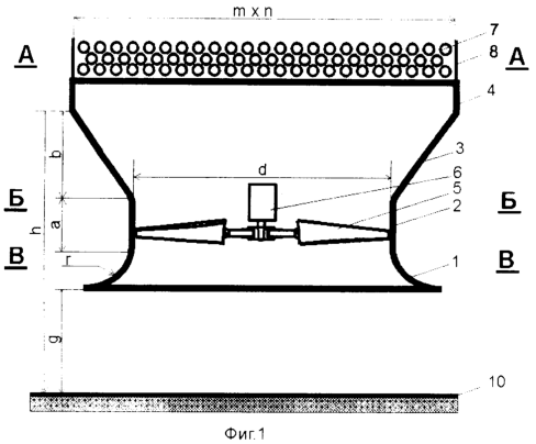 Выполнение кожуха из тканого материала (в частности, из стекловолокнистого материала, пропитанного эпоксидной смолой) позволяет выполнить кожух монолитным либо целиком, либо в поперечном сечении, что обеспечит значительное повышение аэродинамических свойств воздушного тракта. Выполнение же кожуха из вышеописанных поверхностей в сочетании с вышеперечисленными соотношениями элементов поверхности кожуха (которые были найдены в результате теоретических расчетов в сочетании с экспериментальными данными) позволит создать оптимальный тракт, в аэродинамическом отношении, для воздушного потока. Также улучшает аэродинамику и расположение двигателя внутри кожуха.