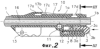 Как представлено на Фиг.5 и 7, внутренняя часть 21 вилки дополнительно содержит два гнезда 50, имеющих многоугольные очертания, например шестиугольные очертания, и достаточную глубину для помещения в них многоугольных гаек 51, типично – шестиугольных гаек, которые, когда внутренняя часть 21 вилки и входная часть 31 камеры 30 давления собраны воедино, остаются удерживаемыми в гнездах 50 стенками задней трубчатой части 35 входной части 31 и удерживаются от проворота посредством соответствия их многоугольной конфигурации многоугольной конфигурации гнезд 50. С другой стороны, в указанной трубчатой части 36 расположены сквозные отверстия 52, которые, когда вилка собрана, совпадают с резьбовыми отверстиями гаек 51, допуская прохождение установочных винтов (не показаны) устройства в корпус конца приклада и ввинчивание в указанные гайки 51. Таким образом, при ввинчивании этих винтов, гайки 51 изнутри прижимаются к металлической трубчатой части 35, устраняя необходимость в выполнении резьбовых отверстий в пластмассовом материале внутренней части 21 вилки для ввинчивания указанных винтов, что, как известно, обеспечивает очень слабое соединение. Как сквозные отверстия 52, так и гнезда 50, предпочтительно, располагаются с радиальной ориентацией в угловых положениях, которые симметричны относительно продольной вертикальной плоскости карабина или ружья.