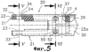 Боковые пластины, продолжающие входную часть 31 камеры 34 давления, содержат две части передних проушин 32, снабженные отверстиями 33, 34, совпадающими по их конфигурации и местоположению соответственно с отверстиями 23, 24 проушин 22 внутренней части 21 вилки, и все они приспособлены для размещения шарнирного штифта 2. Входная часть 31, кроме того, содержит заднюю трубчатую часть 35, составляющую единое целое с камерой 30 давления, снабженную поперечным отверстием 37 для монтажного штифта 5 для внутренней части 21 вилки, вставляемого в соответствующее поперечное отверстие 27.