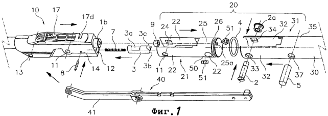 3. Устройство по п.1, отличающееся тем, что ствольную коробку (10), составляющую единое целое с задней частью ствола (1), получают формованием с заделкой задней части (1а) ствола (1) как вставки, ствольная коробка (10) содержит в дополнение к указанному отверстию (11) для шарнирного штифта (2) продольную выемку (12), открытую в задней части для скользящего вхождения в нее указанного фиксатора (3), включающую в себя средства, выталкивающие наружу и удерживающие фиксатор (3), и отверстие (13) для шарнирного штифта первого рычага (41) механизма (40) шарнирных рычагов.