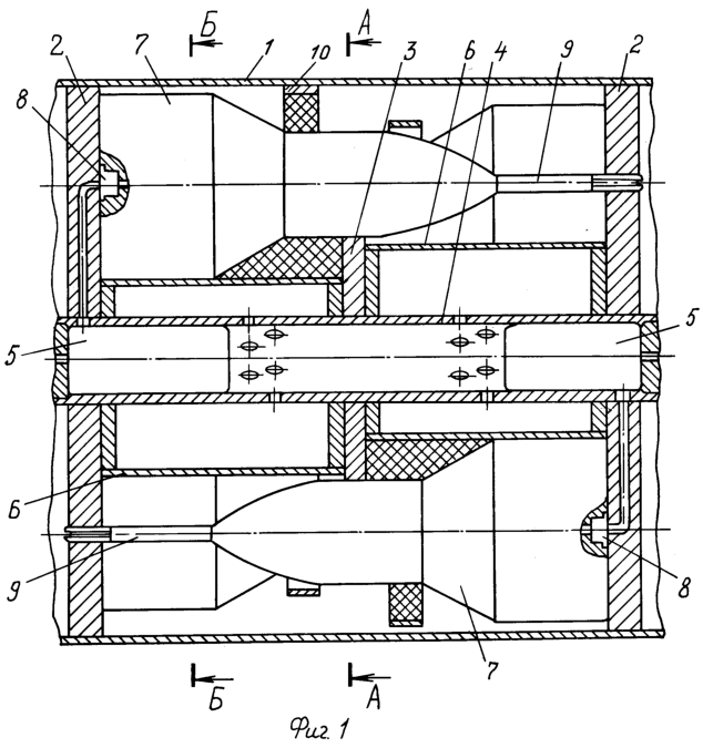 Разовая бомбовая кассета состоит из корпуса 1, каркаса, выполненного в виде фланцев 2, поддерживающего фланца 3, центральной перфорированной трубы 4, газогенератора 5, металлических цилиндров с желобами 6, боевых элементов 7, взрывателей с пироприемниками 8, втулок 9, хомутов 10.