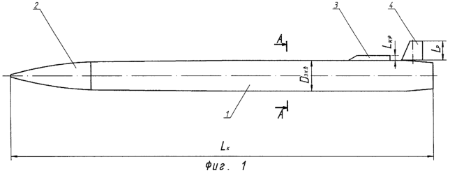 Для оптимизации аэродинамических характеристик ракеты выбраны соотношения размеров корпуса 1 ракеты, ее крыльев 3 и рулей 4, указанные выше.