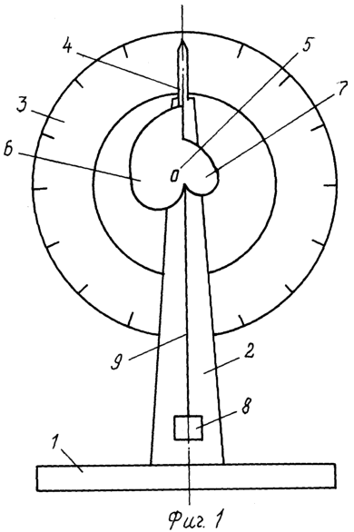 На основании 1 неподвижно закреплены кронштейн 2 со шкалой 3, указательной стрелкой 4 и кулачком 5, состоящим из ветвей 6 и 7 архимедовой спирали с противовесом 8 на конце гибкой связи 9, другой конец которой закреплен на профильной поверхности кулачка 5.