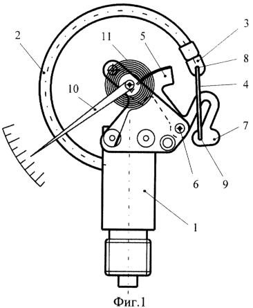 На фиг.1 обозначено: 1 – держатель-основание; 2 – трубчатая пружина Бурдона; 3 – плоский выступ наконечника трубчатой пружины; 4 – тяга; 5 – зубчатый сектор; 6 – ось вращения зубчатого сектора; 7 – хвостовик зубчатого сектора; 8 и 9 – первый и второй шарниры; 10 – указательная стрелка; 11 – спиральная пружина.