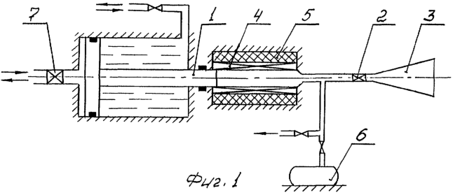 Устройство для осуществления способа, приведенное на фиг.1, содержит мультипликатор давления 1, пусковое устройство 2 и аэродинамическое сопло 3. В малом цилиндре мультипликатора размещены резистивныи нагревательный элемент 4 и элементы тепловой защиты 5 деталей мультипликатора. Устройство снабжено компрессором 6 для закачки рабочего газа в малый цилиндр мультипликатора и клапаном 7, через который подается толкающий газ в большой цилиндр мультипликатора.