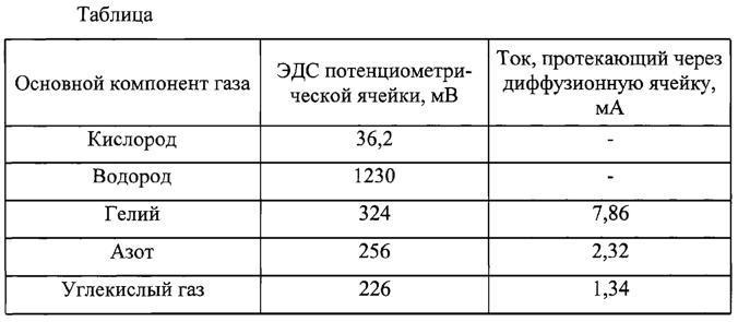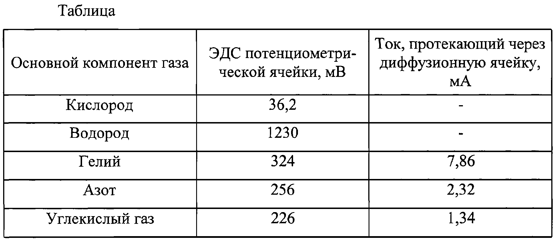 Экспериментально заявляемый способ был проверен на следующих газах: кислороде, водороде, углекислом газе, гелии и азоте. Дополнительная потенциометрическая и диффузионная твердоэлектролитные ячейки изготовлены на основе кислородионной твердоэлектролитной керамики состава ZrO2+0,1Y2O3. Потенциометрическая ячейка выполнена в виде трубки диаметром 8 мм и длиной 150 мм. В средней части трубки снаружи и внутри нанесены платиновые газопроницаемые электроды длиной 30 мм. Диффузионная ячейка изготовлена из конуса длиной 10 мм и средним диаметром 4 мм, в который вклеен с помощью высокотемпературного клея капилляр длиной 70 мм и внутренним диаметром 0,7 мм. На конусе снаружи и внутри по всей длине нанесены платиновые газопроницаемые электроды. Рабочие температуры: потенциометрической ячейки – (836±3)°С, диффузионной ячейки – (750±5)°С поддерживались трубчатыми нагревательными элементами. Анализируемый газ поступал последовательно в потенциометрическую и диффузионную ячейки со скоростью (при дозировании кислорода учитывалось добавление кислорода). При работе с углекислым газом, гелием и азотом с помощью дополнительной ячейки в анализируемом газе создавалась концентрация кислорода, равная 20%, путем пропускания через ячейку тока, равного 0,58 А. Измеренные значения ЭДС потенциометрической ячейки и тока через диффузионную ячейку приведены в таблице. Время установления показаний во всех случаях не превышало 3 мин.