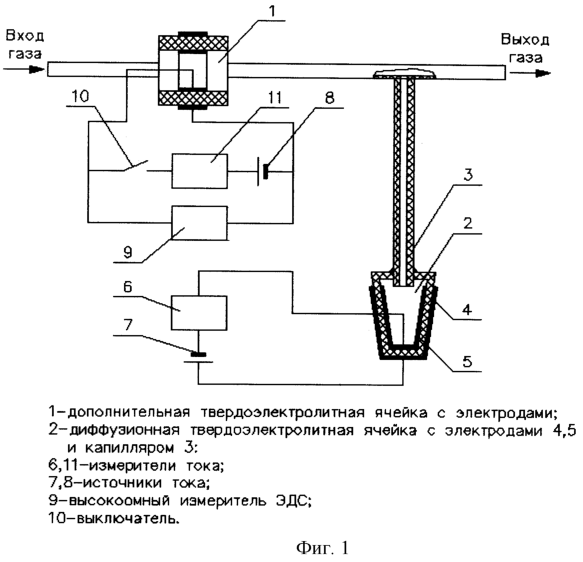 Анализируемый газ с определенной скоростью поступает в дополнительную потенциометрическую твердоэлектролитную ячейку 1, после чего анализируемый газ омывает вход в капилляр 3 диффузионной твердоэлектролитной ячейки 2. Твердоэлектролитные ячейки работают при температурах 650-900°С. Вначале измеряют ЭДС дополнительной потенциометрической ячейки с помощью высокоомного измерителя 9 при выключателе 10 в положении “ВЫКЛЮЧЕНО”. Если сравнительной средой, омывающей наружный электрод дополнительной потенциометрической твердоэлектролитной ячейки, является атмосферный воздух, то при ЭДС менее минус 30 мВ, основным компонентом газа является кислород, если ЭДС более 800 мВ, то основным компонентом является горючий газ (Н2, CH4 и др.). Если ЭДС ограничена в указанных выше пределах, то выключатель 10 переводят в положение “ВКЛЮЧЕНО”, и с помощью источника тока 8 через измеритель тока 11 и дополнительную твердоэлектролитную ячейку пропускают определенный ток, переносимый ионами кислорода, благодаря чему создают в анализируемом газе определенную известную концентрацию кислорода, рассчитываемую в соответствии с законом Фарадея. Анализируемый газ далее омывает капилляр 3 диффузионной твердоэлектролитной ячейки 2. К электродам 4 и 5 ячейки последовательно подключены источник тока 7 (плюс к наружному электроду 4) и измеритель тока 6. Ток, протекающий через диффузионную твердоэлектролитную ячейку, позволяет судить о характере основного компонента газа. Это связано с тем, что указанный ток зависит не только от концентрации кислорода, но и от его коэффициента диффузии, который в свою очередь зависит от основного компонента анализируемого газа. Зависимость тока диффузионной твердоэлектролитной ячейки от концентрации кислорода для различных контрольных газов приведена на фиг.2. Как видно, например, при концентрации кислорода 40%, гелию соответствует ток 15 мА, азоту – 4,3 мА и т.д.