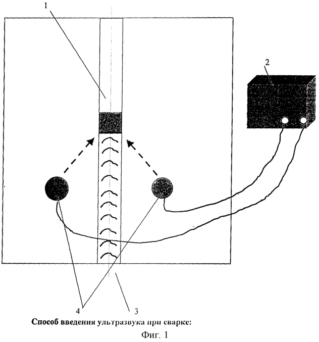 Устройство содержит два ультразвуковых преобразователя 4, подключенных к ультразвуковому генератору 2, которые фиксируются с двух сторон от сварного соединения 1. Расстояние ультразвуковых преобразователей от сварного шва 3 выбирается исходя из режима сварки.