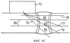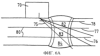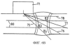 Затем на схему наносят местоположения преобразователей и возможные пути прохождения звука от местоположений преобразователей. На фиг.5 приведены три отдельных варианта схемы, показывающие местоположения преобразователей и пути прохождения звука для трех различных стандартных преобразователей 70, 71 и 72, обычно имеющихся на рынке. От преобразователей показаны путь прохождения звука 75 под углом 45°, путь прохождения звука 76 под углом 60°, путь прохождения звука 77 под углом 70° и путь прохождения звука 78 с ползущей волной. Далее, металл 50 шва и зоны 54 термического влияния на схеме разделяют, по меньшей мере, на две зоны контроля. Как показано на фиг.6, к схемам на фиг.5 добавлены горизонтальные разделительные линии 80, которые разделяют металл шва и зоны термического влияния, изображенные на схемах, на три зоны равной ширины: верхнюю зону контроля 82, промежуточную зону контроля 83 и нижнюю зону контроля 84. Хотя и предпочитается, но не требуется, чтобы разделительные линии были совершенно горизонтальными или даже прямыми, а зоны были равной ширины. С преобразователями, обычно используемыми в настоящее время, предпочитается, чтобы каждая зона составляла максимум около 8-10 мм толщины фактических металла шва и зон термического влияния, так что при толщине листов меньше, чем около 16 мм, схему металла шва и зон термического влияния следует разделять только на две зоны контроля, а при толщине листов больше, чем около 32 мм, схему разделяли бы, по меньшей мере, на четыре зоны контроля.