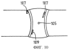 Для подтверждения надежности тележки и осуществления программного обеспечения полезно тестировать тележку на дополнительном пробном сварном шве, как, например, на таком, который виден на фиг.10. И в этом случае пробный сварной шов должен быть выполнен из материалов, сходных с материалами в дефектоскопируемом сварном шве, и должен иметь геометрические параметры, сходные с геометрическими параметрами дефектоскопируемого сварного шва. Он также должен иметь искусственные дефекты, как, например, просверленные сбоку отверстия 105, надрезы 107, выполненные на электроэрозионном станке, или дефекты 109, сделанные сварщиком.