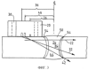 Как видно на фиг.3, преобразователь 20 для ползущей волны выполнен для испускания звука вдоль верхнего пути прохождения звука 22 к верхней части 24 металла шва 50 и зон термического влияния 54. В показанном варианте осуществления изобретения преобразователь для ползущей волны имеет корпус размером 40×40 мм, расстояние отдаления 26 от центральной линии дефектоскопируемого сварного шва, равное 33 мм, и частоту 2-4 МГц. Для контроля качества верхней части металла шва и зон термического влияния могли быть также использованы и другие преобразователи, но предпочитается использование преобразователя для ползущей волны.