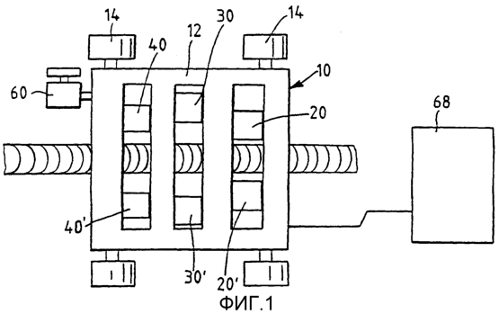 На фиг.1 и 2 показан один вариант реализации тележки 10, которая может быть эффективно использована для автоматизированной ультразвуковой дефектоскопии аустенитного сварного шва. Показанная тележка содержит раму 12, магнитные колеса 14, преобразователь 20 для ползущей волны, преобразователь для промежуточной зоны 30 и преобразователь для нижней зоны 40.