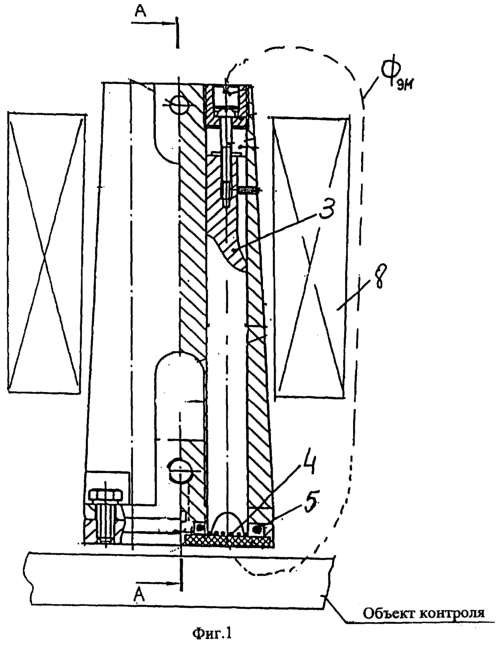 Катушками индуктивности 4 излучаются первичные электромагнитные волны (зондирующие импульсы высокой частоты), вызывающие в объекте контроля ультразвуковые волны той же частоты, вызывающие в свою очередь, механические колебания частиц металла, которые приводят в постоянном магнитном поле Фэм к возникновению вторичных магнитных волн Фм, пересекающих катушки индуктивности. При этом часть магнитного потока Фмк пересекает катушки индуктивности, в которых возникает электрический ток Iмк, а другая часть магнитного потока, представляющая собой поток рассеяния Фму, пересекает усилитель, в котором индуцируется ток Iму, складывающийся по величине и направлению с током Iмк.