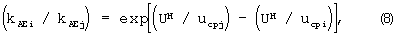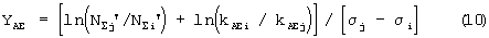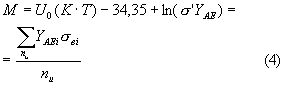 kAEi, kAEj – акустико-эмиссионные коэффициенты при напряжениях При равномерном ступенчатом нагружении контролируемого изделия в качестве значений В качестве информативного параметра Отношение kAEi/kAEj определяется в зависимости от выбранного закона распределения амплитуд импульсов АЭ по следующим формулам: – для равновероятностного распределения амплитуд импульсов АЭ: – для показательного распределения амплитуд импульсов АЭ: – для экспоненциального распределения импульсов АЭ: где ucpi, ucpj – средние амплитуды импульсов АЭ при напряжениях m – параметр показательного распределения; UH – нижний порог дискриминации измерительной аппаратуры. Для определения класса опасности, выявленного в контролируемом объекте источника импульсов АЭ, определяют диагностический параметр YR: где М – константа материала конструкции и условий ее нагружения, определяется по справочным данным или результатам разрушающих АЭ-испытаний эталонных (бездефектных) образцов и следующей формуле: где U0 – энергия активации процесса разрушения материала конструкции /справочное/; К – постоянная Больцмана; Т – абсолютная температура;