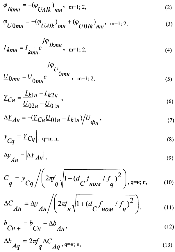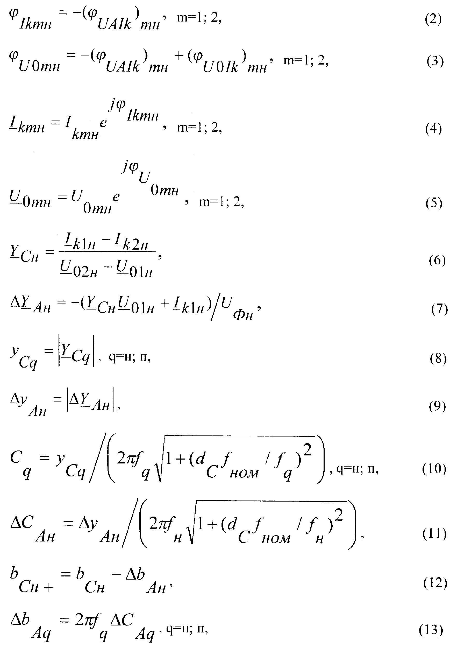По результатам первых и вторых совместных измерений величин напряжений, тока, фазовых углов и частоты определяют по формулам (2)…(10) при q=H емкость сети Сн в момент компенсации, по формуле (11) дополнительную емкость CAнв фазе А сети, по формулам (12)…(15) при q=н емкостную асимметрию сети н в момент компенсации, по формулам (16), (17) степень расстройки компенсации н+ в состоянии сети, непосредственно следующем за отключением дополнительной емкости в фазе А сети по завершении очередной компенсации, по формуле (18) при q=н емкость сети Сн+ в состоянии сети, непосредственно следующем за отключением дополнительной емкости в фазе А сети по завершении очередной компенсации, по формуле (19) при q=н максимальный емкостный ток однофазного замыкания сети на землю (IСн+)fном,Uфном Для состояния сети непосредственно после периодической компенсации емкостного тока однофазного замыкания сети на землю и отключения дополнительной емкости в фазе А сети при f=fном; Uф=Uфном.