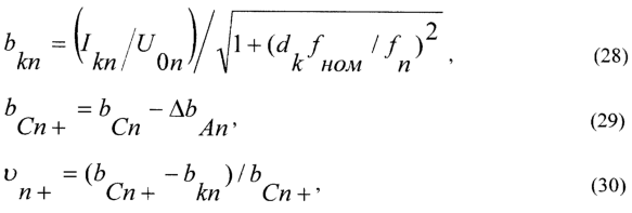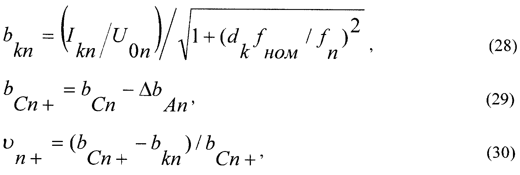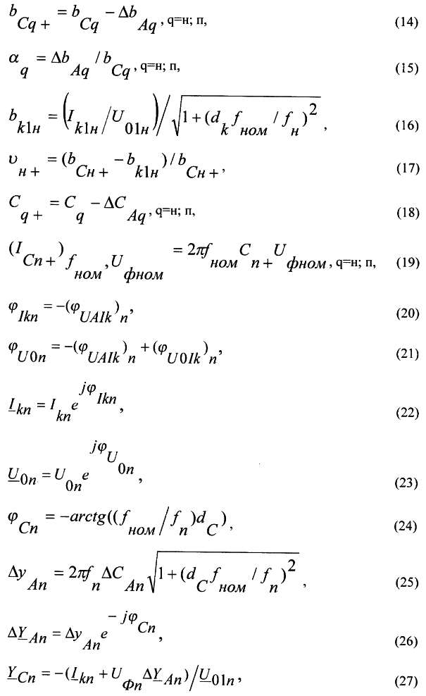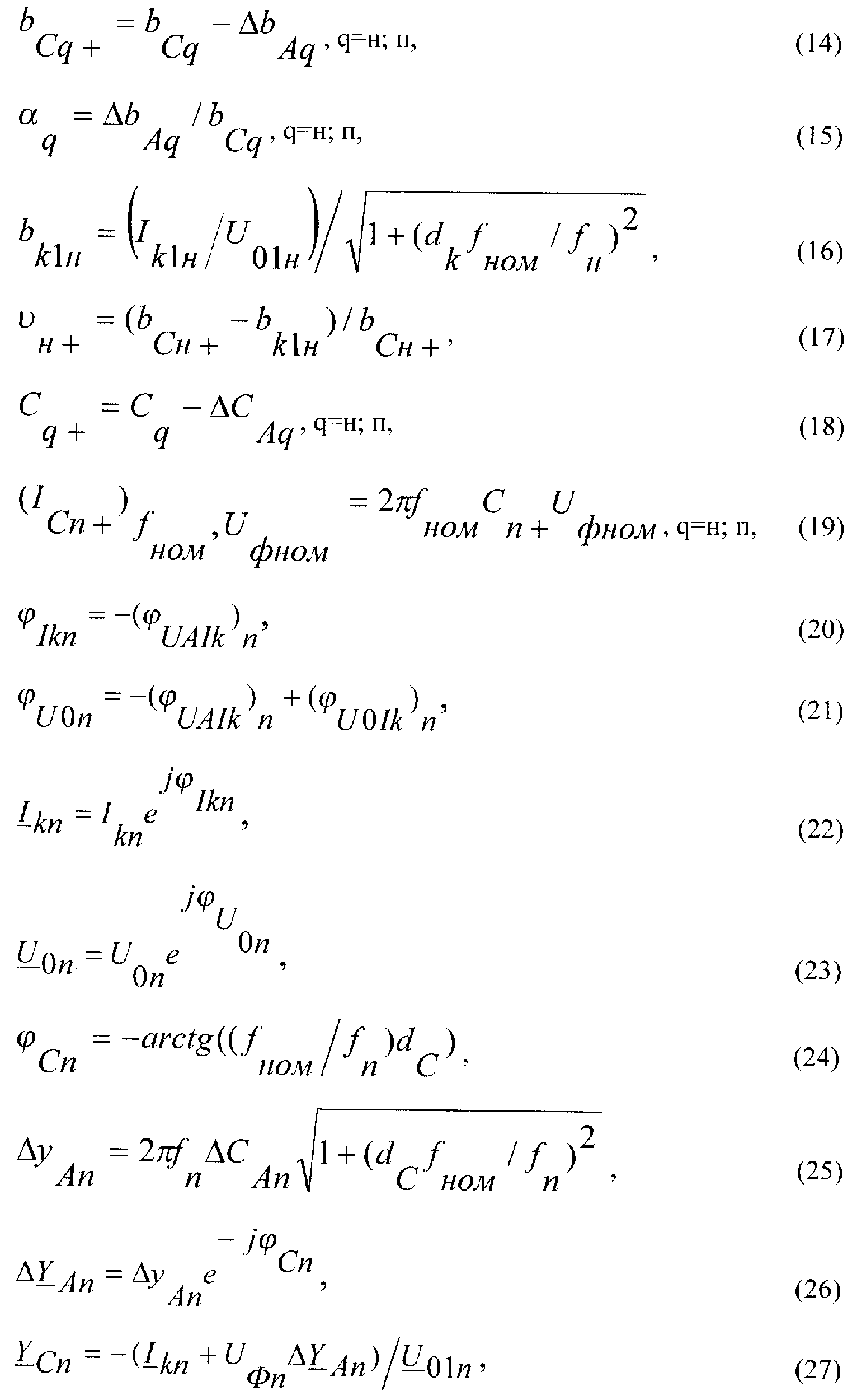 – степень расстройки компенсации, подстрочный индекс “А” при символах параметров указывает на принадлежность параметра к фазе А сети, к которой для определенности подключают дополнительную емкость; подстрочные индексы “н” и “п” при символах параметров указывают на принадлежность соответственно к настройке реактора при периодической компенсации емкостного тока однофазного замыкания на землю и к промежутку времени между очередными компенсациями емкостного тока однофазного замыкания сети на землю; подстрочные индексы “С” и “k” при символах параметров указывают на принадлежность символа соответственно к сети без учета реактора и к реактору; подстрочный индекс “m” при символах параметров указывает на принадлежность к состоянию перестройки ответвлений реактора (при первом состоянии m=1, при втором состоянии m=2); подстрочный индекс “+” при символах параметров указывает на принадлежность к состоянию, непосредственно следующему за отключением дополнительной емкости в фазе А сети; подстрочный индекс “ном” при символе параметра указывает на номинальное его значение; подчеркивание символов напряжения и тока указывает на комплексный характер их величин.