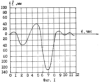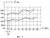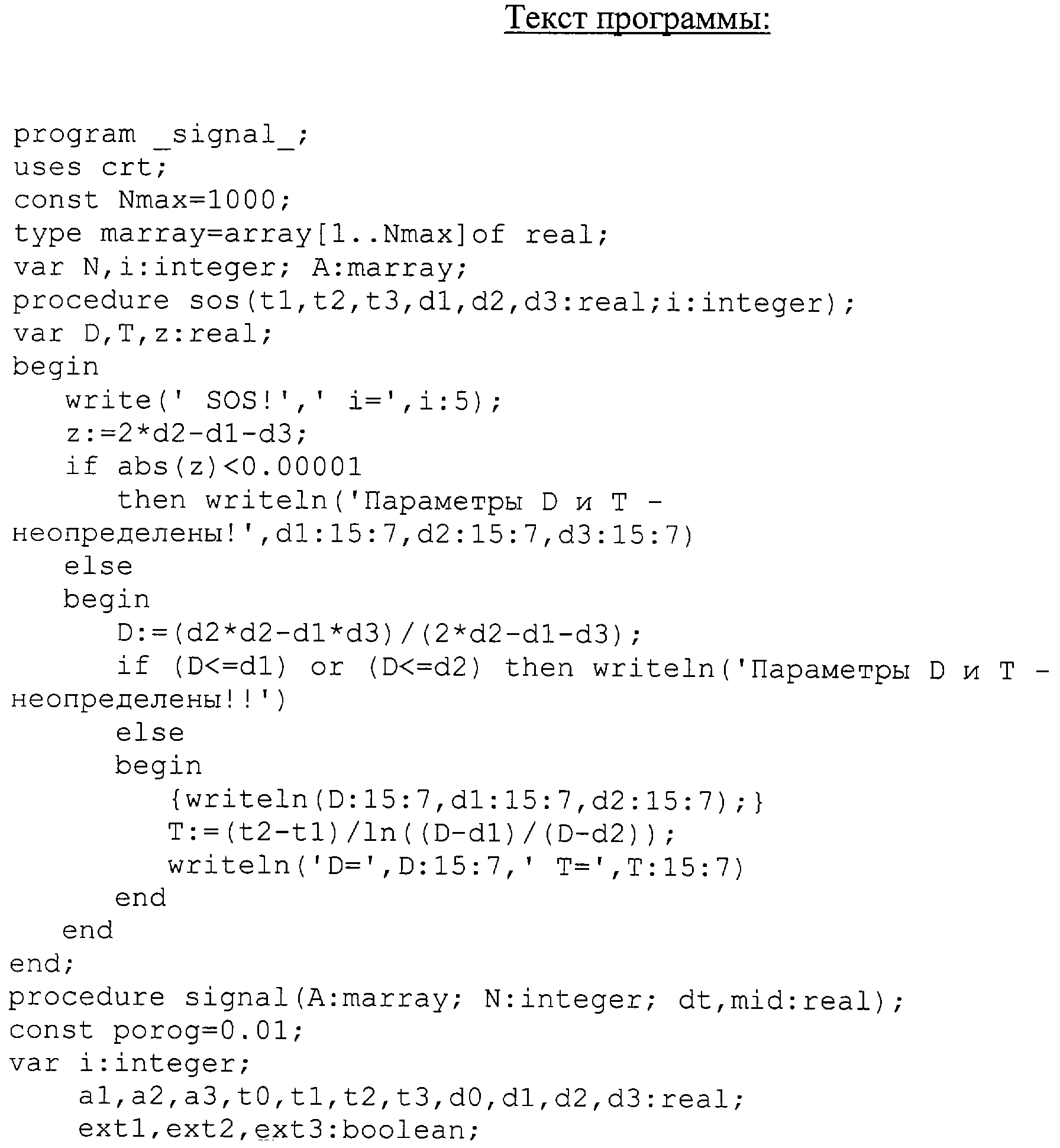 Счетчик-расходомер «Метран» состоит из виброакустического преобразователя «Метран-300 ПР» и вычислителя расхода «Метран-310 ВР». В указанной комплектации обеспечивается индикация следующих величин: объемного и массового расхода, накопленных объема и массы жидкости, текущего времени, суммарного времени работы. Диапазон измерений 100…250 см3/с, относительная погрешность ±0,72%. Данные выдаются на жидкокристаллический индикатор по запросу пользователя. Предусмотрена возможность программирования вычислителя с его клавиатуры и связь с ПЭВМ по каналу RS 232. Реализация функций сигнала дебита скважин иллюстрируется фиг.2. Раскачка очага и распространяющиеся от него литосферные волны представляют собой переходный колебательный процесс с нарастающей амплитудой от состояния покоя (момента возникновения) до удара («вспарывания» очага). Параметры переходного процесса содержат информацию о характеристиках ожидаемого землетрясения. Известно (см., например, Н.С.Пискунов, Дифференциальное и интегральное исчисление, учебник для вузов, том.1, издание 5-е, Наука, М., 1964 г., стр. 442-451), что искомая функция и скорость ее изменения связаны дифференциальным уравнением первой степени, а общим решением дифференциального уравнения первой степени является экспонента. Следовательно, огибающая амплитуды раскачки очага представляет собой экспоненту. Начальные условия для решения дифференциального уравнения и вычисления постоянной экспоненты (Т) определяют путем обработки массива регистрируемых измерений наблюдаемого параметра. Программа обработки представлена в примере реализации. Графики огибающих переходного процесса иллюстрируются фиг.4. Экспоненциальная зависимость вида достигает максимального значения с вероятностью 0,99 при tу=4,7Т, которое принимают за время ожидаемого удара (tу), отсчитываемого от начала периодических отклонений наблюдаемого параметра. В соответствии с зависимостью Гутенберга-Рихтера (см., например, «Краткосрочный прогноз катастрофических землетрясений с помощью радиофизических наземно-космических методов». Доклады конференции, РАН, ОИФЗ им. О.Ю.Шмидта, М., 1998, стр. 10) при известном времени существования предвестника в виде сейсмических волн магнитуду ожидаемого удара вычисляют из соотношения: lgtу[сут]=0,54M-3,37.
