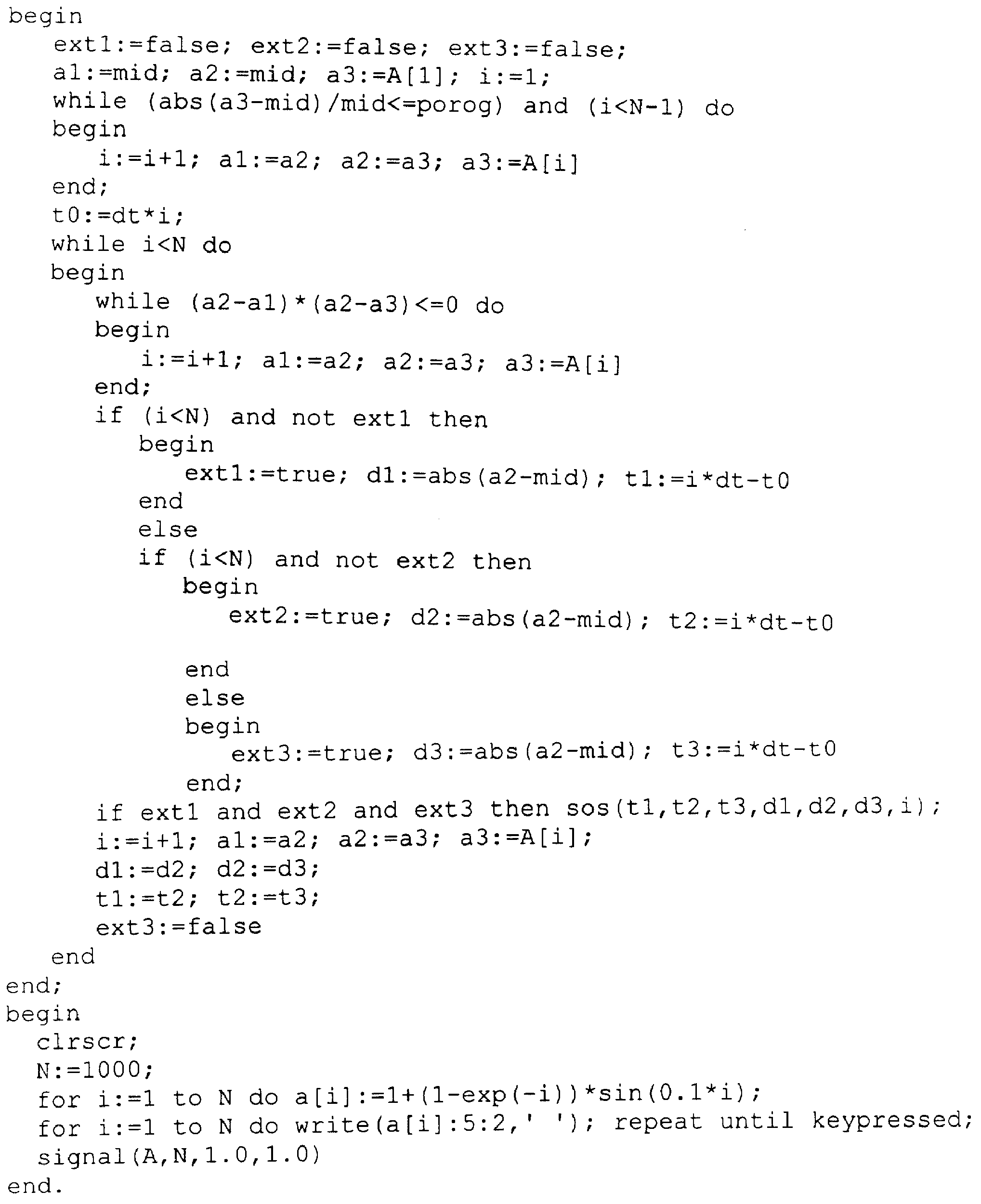 Селектируемыми признаками сигнала-предвестника землетрясения являются: момент возникновения периодических отклонений (превышение сигналом установленного порогового уровня) и скорость изменения огибающей сигнала во времени. Скрытая информация о характеристиках предстоящего удара содержится в модулирующей функции сигнала-предвестника, изменяющейся синфазно с раскачкой очага. Выделение модулирующей функции сигнала-предвестника осуществляют по массиву регистрируемых измерений. Для чего в непрерывно получаемых выборках измерений определяют момент появления сигнала-предвестника. Затем вычисляют параметры переходного процесса. Извлечение скрытой информации из массива получаемых измерений реализуется следующей программой (см. в конце описания).
