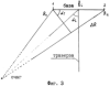 Гипотетический центр очага землетрясения определяют методом пеленгации (см., например, «Теоретические основы радиолокации» под редакцией В.Е.Дулевича, учебник, Сов. Радио, М., 1964 г., стр. 34-48). Для чего предварительно вычисляют время запаздывания сигнала ti в разнесенных на базе bi точках измерителей. Разность хода литосферных волн, как это иллюстрируется фиг.3, составляет R=R1-R2=bi·sin i. Время прихода литосферных волн в каждом пункте вычисляют программным методом, путем сравнения относительного изменения амплитуды сигнала с пороговой величиной. За величину порога принимают среднеквадратическую ошибку измерителя «Метран», т.е. Временная задержка равна разности времен прихода сигнала в точках измерителей ti=t2-t1. Отсчет проводят по синхронизованным таймерам компьютеров измерителей. Поскольку то направление на центр очага соответственно: где – скорость литосферных волн в земной коре, которую измеряют сейсмическими методами при создании измерительного полигона (см., там же, К.Уотерс, «Отражательная сейсмология»). Гипоцентр очага находят как точку пересечения нескольких линий, проведенных от середины баз под углами i к соответствующим базам. Чем больше база, тем выше крутизна пеленгационной характеристики и тем точнее результат определения гипоцентра очага.