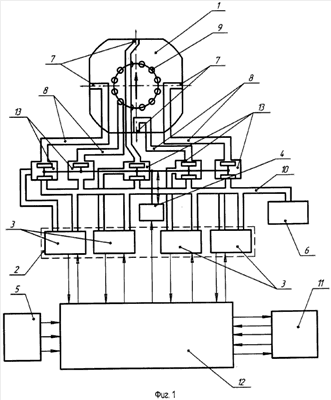 При обдуве датчика ветра и давления во входных отверстиях 7 обтекателя 1 создаются разности давления относительно канала статического давления 10. Преобразование давления, создающегося при обдуве, осуществляется по трехвходовой схеме, т.е. измеряется разность давлений между каждым из четырех входных отверстий обтекателя и каналом статического давления, соединенного с окружающей средой рядом отверстий в нижней части корпуса, предназначенных для забора усредненного значения статического давления. При отключенном электромагните 4 верхние клапаны 13 закрыты, и давление во входных каналах 8 каждого из датчиков перепада давления 3 уравновешено. При срабатывании электромагнита 4 верхние клапаны 13 открываются, и давление от четырех входных каналов 8 и канала статического давления 10 передается на датчики перепада давления 3 и датчик атмосферного давления 6. Одновременно нижние клапаны 14 закрываются, прерывая воздушное сообщение между первыми входами датчиков перепада давления 3. Открытие и закрытие клапанов 13, 14 осуществляется электромагнитом 4, которым управляет блок управления электромагнитом 5.