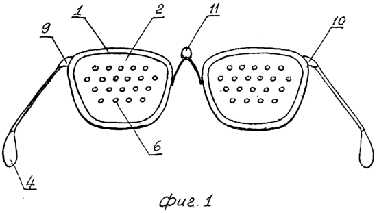 На фигуре 1 и 2 изображены очки-тренажеры, состоящие из оправы (1), прозрачных жидкокристаллических линз-экранов (2) с нанесенной на их поверхность тонирующей пленкой (8), микрочипа (3) с программами работы и проецируемыми матрицами (5), источника питания (4), кнопки выбора матриц и режима работы (7), датчика освещенности (9), датчика измерения спектрального состава света (10), дальномера.