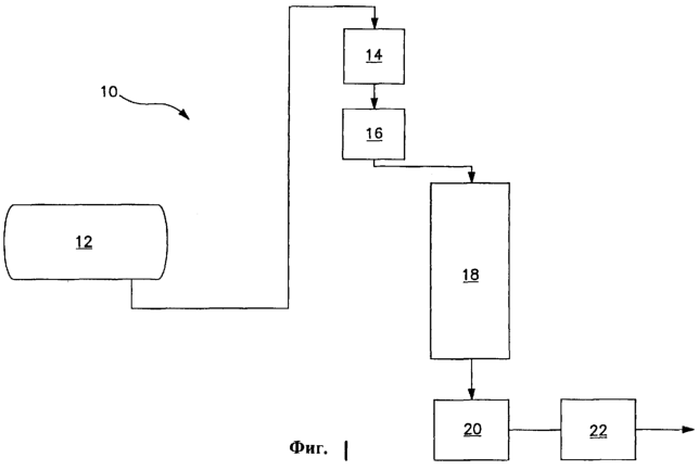 На фиг.1 показана упрощенная блок-схема системы реактора для производства полипропилена 10 в соответствии с настоящим изобретением. Эта система 10 может быть использована для производства гомополипропилена и случайных сополимеров пропилена и этилена. В своей наиболее простой форме система включает в себя первый реактор полимеризации 12, рукавный растягивающийся фильтр 14, вращающийся питатель 16, колонну очистки 18, второй вращающийся питатель 20 и гранулятор 22.