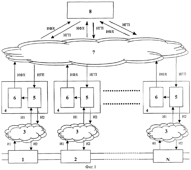 Каждая из вычислительных машин нижнего уровня 4 находится в пределах одной из подсистем электроэнергетической системы. Вся относящаяся к одной из подсистем 1,2…N информация, необходимая для решения задачи расчета оптимального режима электроэнергетической системы, передается по средствам связи нижнего уровня 3 в соответствующую вычислительную машину нижнего уровня 4. Этот поток информации обозначен на фиг.1 как И1. Относящаяся к данной подсистеме информация о результатах расчета оптимального режима также передается по этим средствам связи. Этот поток информации обозначен на фиг.1 как И2. Направленный от каждой из вычислительных машин нижнего уровня 4 через средства связи верхнего уровня 7 к вычислительной машине верхнего уровня 8 поток информации содержит данные о функциональных характеристиках каждой подсистемы и обозначен на фиг.1 как ИФХ. В противоположном направлении по указанным средствам связи проходит поток информации, содержащий данные о граничных переменных каждой из подсистем 1,2…N, который обозначен на фиг.1 как ИГП.
