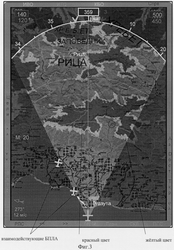 – на фиг.3 представлен информационный кадр аэронавигационной карты с символами ведущего и двух взаимодействующих БПЛА;