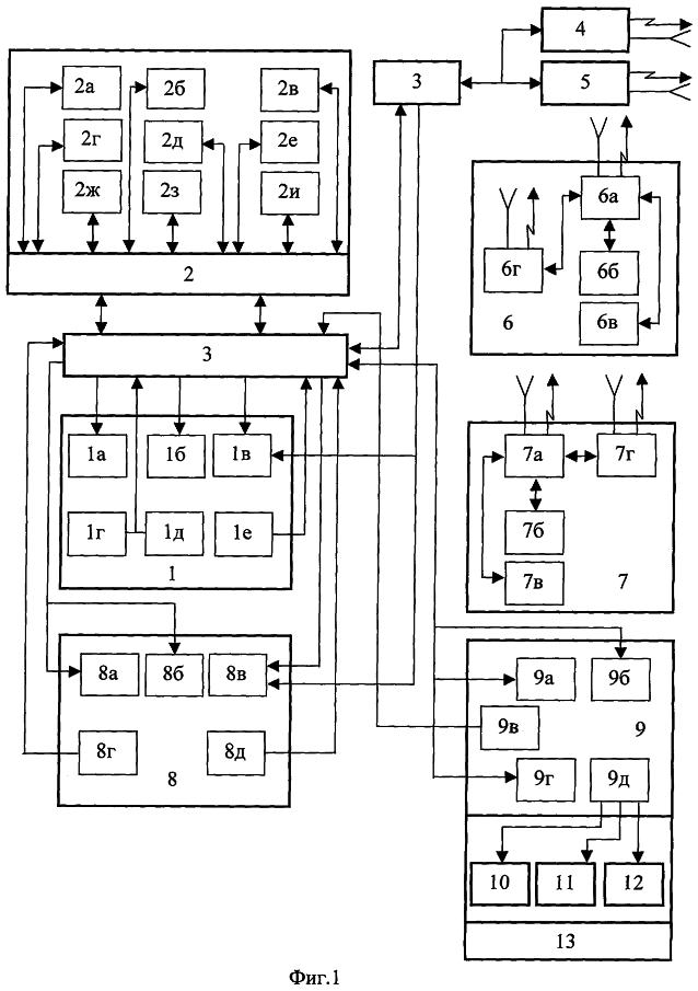 Управляемый объект 6 и взаимодействующие летательные аппараты 7 содержат модули связи 6а и 7а с наземным пунктом управления и бортовым оборудованием, модули связи 6г и 7г с взаимодействующими летательными аппаратами, телевизионную систему и оптико-электронное визирное устройство 6б и 7б, систему автоматического управления с бортовыми датчиками и модуль навигации 6в и 7в.